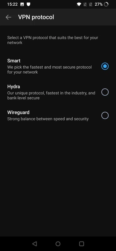 L'application utilise par défaut le protocole Hydra pour établir une connexion chiffrée entre votre appareil et les serveurs VPN distants . Ce protocole basé sur TLS prend en charge WireGuard et IKEv2/IPSec sur les appareils Android les plus récents. Une fois la connexion établie, votre adresse IP réelle sera remplacée par une adresse virtuelle.