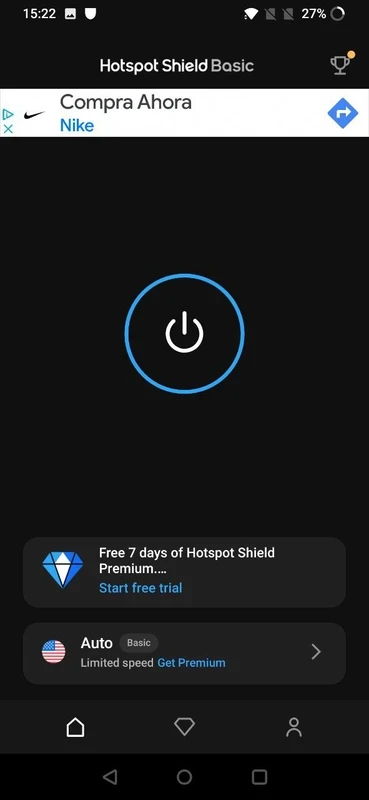 C'est l'une des fonctionnalités clés qui vous permet d'apparaître virtuellement dans la région de votre choix. Cependant, veuillez noter que la version gratuite vous connecte automatiquement au serveur américain, et ce, à une vitesse limitée. Pour accéder à des serveurs plus performants, vous devez appuyer sur le bouton d'alimentation situé sur l'écran principal afin de choisir entre la version avec publicité et la version premium. Cette dernière propose une publicité pendant 15 minutes de connexion, ou augmente la durée de connexion en fonction du nombre de publicités visionnées.